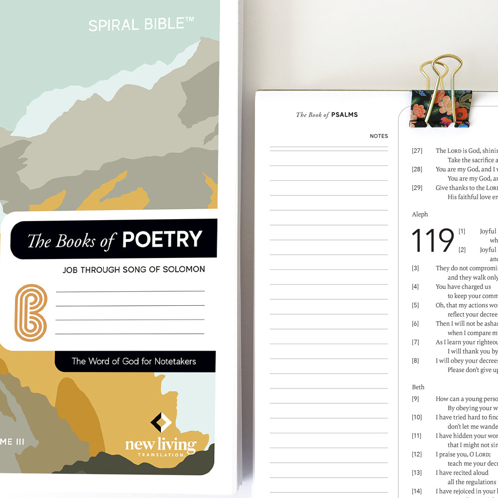 Engage with the beauty and wisdom of Scripture through our spiral-bound edition of the Books of Poetry, featuring the New Living Translation: Job, Psalms, Proverbs, Ecclesiastes, and Song of Solomon. These poetic books offer profound insights into life’s deepest questions, expressions of worship, and the pursuit of wisdom and love. The NLT’s clear, contemporary language brings these timeless writings to life, making it easier to connect with the emotional depth and spiritual richness they offer.