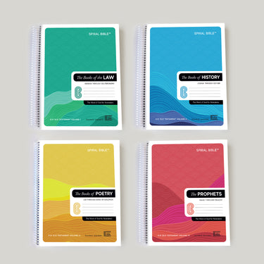 SAVE 25% with the 4-Volume Old Testament Bible Bundle! Each volume is spiral bound and lays completely flat so you can read, study, take notes, color, or draw. All volumes are 8.5 x 11 with double-wide margins, a large font, and printed on durable white notebook paper. Lay them flat and mark them up! The spiral binding is guaranteed not to break, or your money back!
