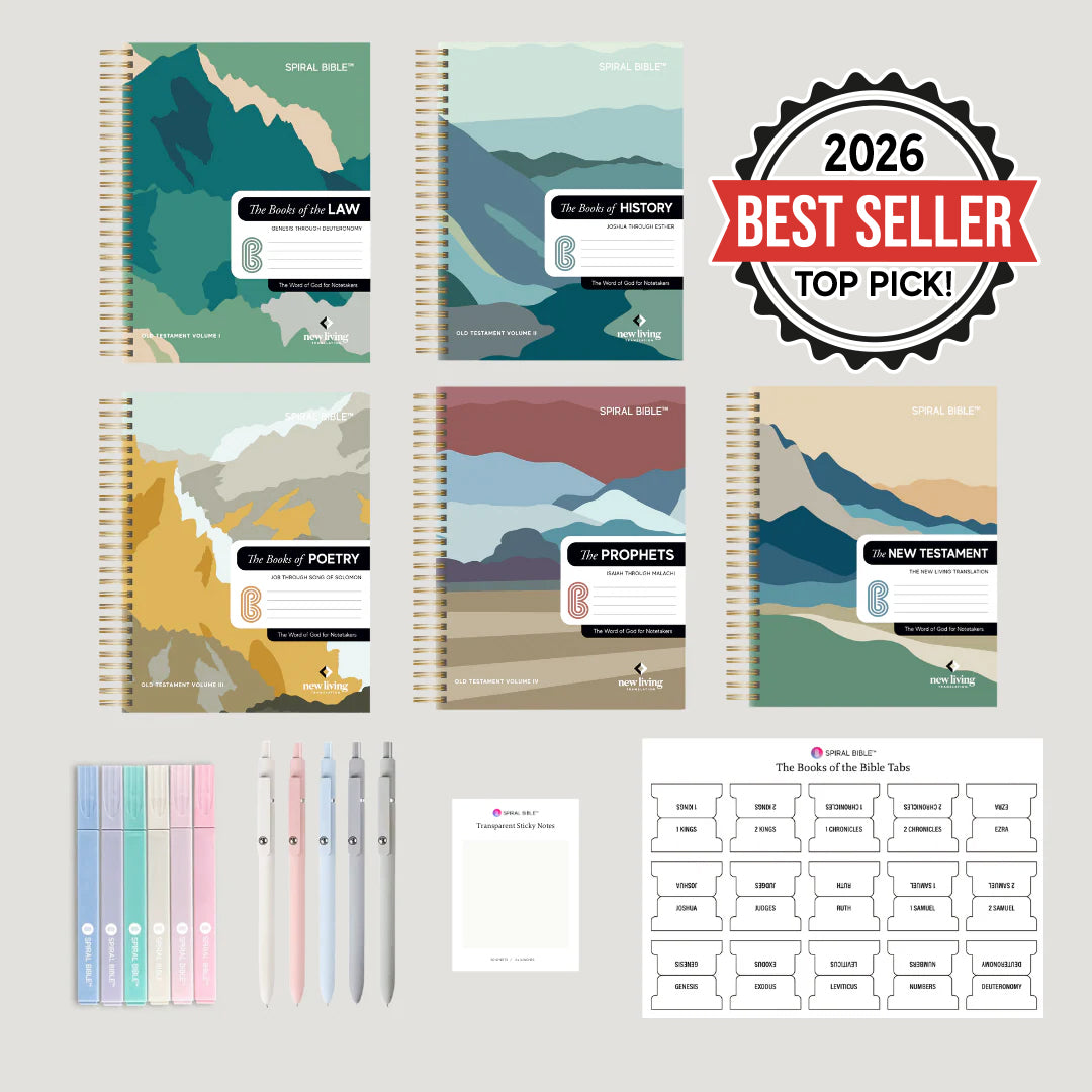 This bundle includes the complete NLT Spiral-Bound Journaling Bible, divided into five easy-to-use volumes: The Books of Law, History, Poetry, Prophets, and the New Testament. Each volume is specifically designed for in-depth note-taking, featuring the NLT Bible text in an easy-to-read format with generous space for your thoughts and reflections. The spiral binding ensures that the pages lay completely flat, making it ideal for journaling, prayers, and study sessions.