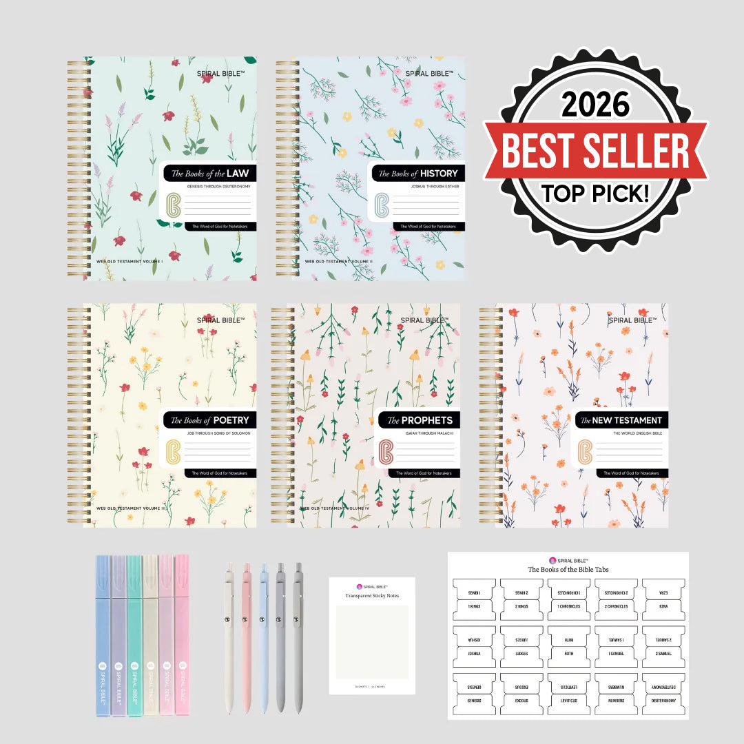 This bundle includes the complete WEB Spiral-Bound Journaling Bible, divided into five easy-to-use volumes: The Books of Law, History, Poetry, Prophets, and the New Testament. Each volume is specifically designed for in-depth note-taking, featuring the WEB Bible text in an easy-to-read format with generous space for your thoughts and reflections. The spiral binding ensures that the pages lay completely flat, making it ideal for journaling, prayers, and study sessions.