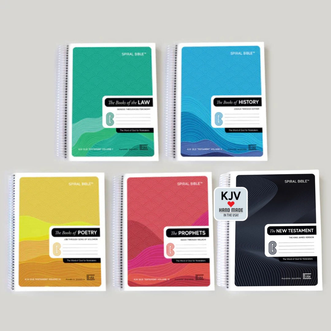 The KJV Spiral-Bound Journaling Bible, Five-Volume Set was created from the ground up to facilitate in-depth note taking. Divided into 5 individual volumes - The Book of Law; History; Poetry; Prophets; and New Testament - this set features the complete KJV Bible text in an inviting, easy-to-read layout with generous space for notes. The spiral-bound format lays flat for comfortable reading and writing. Designed to encourage deeper interaction with Scripture, this journaling edition is ideal for recording prayers and reflections.
