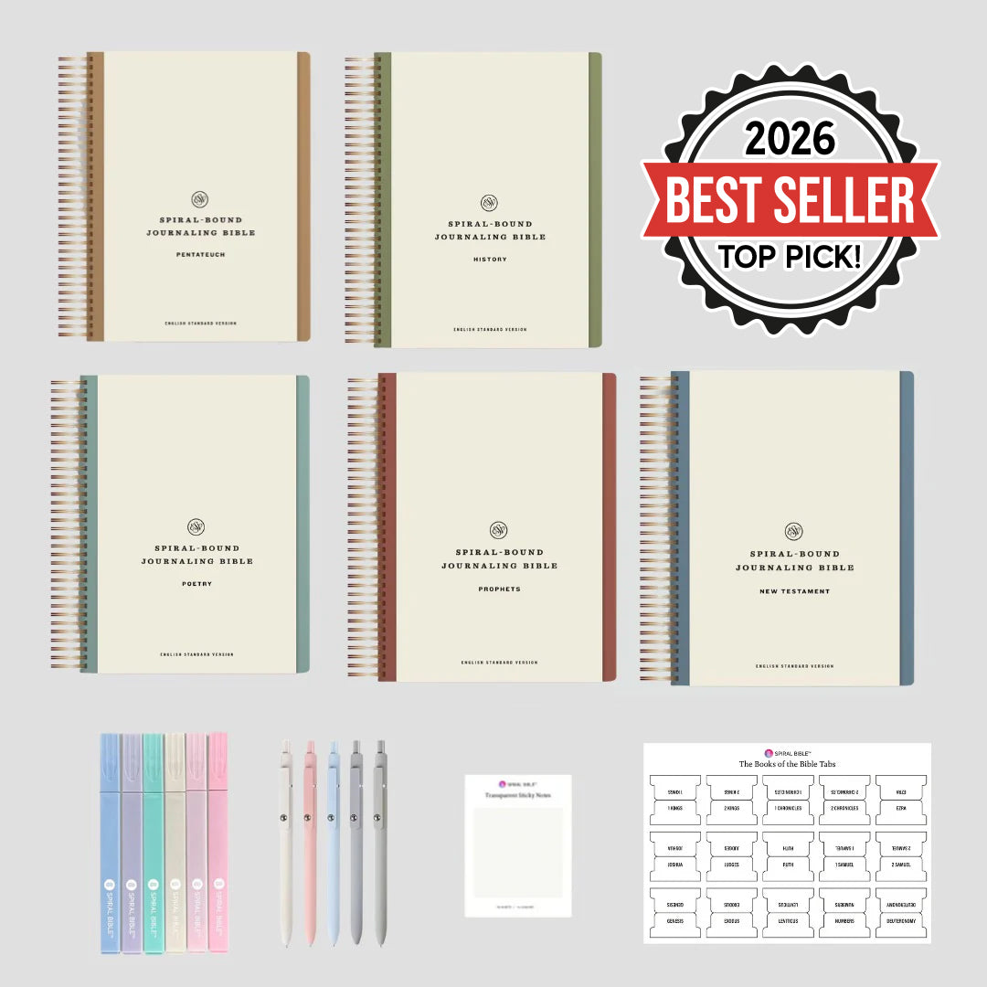 This bundle includes the complete ESV Spiral-Bound Journaling Bible, divided into five easy-to-use volumes: The Books of Law, History, Poetry, Prophets and the New Testament. Each volume is specifically designed for in-depth note-taking, featuring the ESV Bible text in an easy-to-read format with generous space for your thoughts and reflections. The spiral binding ensures that the pages lay completely flat, making it ideal for journaling, prayers, and study sessions.