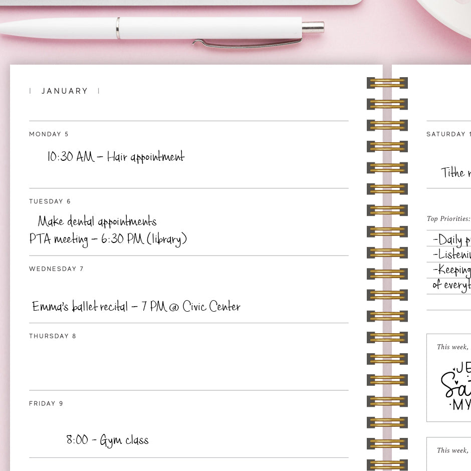 Inside, you'll find a full annual overview, monthly and daily views, and a weekly layout that helps you focus on what truly matters—your priorities, intentions, gratitude, and prayers. Each page features an encouraging Bible verse to keep your heart centered on Christ.